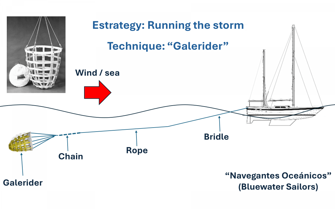 The “Galerider” towing device has been used on numerous occasions by deploying it from the stern during a storm, reducing the sailboat’s speed, minimizing surfing, and improving its handling with an autopilot. In this chapter, we will describe this drogue device and consider some aspects of its use on a sailboat.