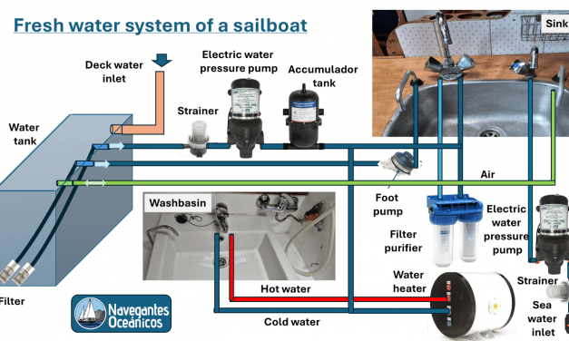 Key aspects of the freshwater system of a sailboat: freshwater tanks, freshwater circuit with an electric pressure pump, hot water on board, drinking water, freshwater circuit with hand/foot pump, tank ventilation, and seawater circuit (in sink).