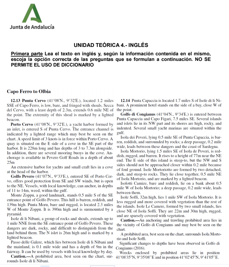 Examen de Capitán de Yate. Módulo genérico. JUL 24. Posted by Juan González-Aller Lacalle | Sep 3, 2024 | Examen CY | 0 | Antes de empezar el test descarga el siguiente fichero: Texto Inglés JUL24 Examen de Capitán de Yate. Módulo genérico. JUL 24. 10 preguntas de la UT 3. Meteorología y 10 de la UT 4. Inglés. Descargar texto de inglés antes de comenzar el examen. 1 / 20 1. UNIDAD TEÓRICA 3. METEOROLOGÍA En un ciclón tropical, si los vientos rolan en sentido anti-horario: a) El buque está en el semicírculo DERECHO, PELIGROSO en el hemisferio NORTE. b) El buque está en el semicírculo IZQUIERDO, MANEJABLE en el hemisferio SUR c) El buque está en el semicírculo IZQUIERDO, PELIGROSO en el hemisferio NORTE. d) El buque está en el semicírculo IZQUIERDO, PELIGROSO en el hemisferio SUR. 2 / 20 2. El frente que separa las masas de aires polares de las tropicales se denomina: a) Frente de Convergencia Tropical. b) Frente Polar. c) Frente Ártico o Zona de Convergencia Ártica. d) Frente Tropical. 3 / 20 3. El Monzón continental en invierno boreal: a) Sopla de sur a norte. b) Sopla de la tierra al mar. c) Sopla del mar a la tierra. d) Todas las opciones anteriores son falsas. 4 / 20 4. De las siguientes afirmaciones señale la opción correcta. a) La atmósfera está constituida exclusivamente por una mezcla de gases nobles. b) Los principales componentes de la atmósfera son el oxígeno (21% del volumen total) y el hidrógeno (78% del volumen total). c) En la atmósfera la cantidad de vapor de agua aparece en cantidades constantes, manteniéndose su concentración con la altura. d) El vapor de agua juega un papel decisivo en el comportamiento de la atmósfera. 5 / 20 5. En relación a los hielos señale la opción correcta. a) El Drift-ice es hielo sumergido unido al fondo. b) El bar-ice es hielo cubierto de nieve. c) El fast-ice es hielo glaciar que permanece fijo a lo largo de la costa. d) Todas las opciones anteriores son falsas. 6 / 20 6. De las siguientes afirmaciones marque la opción correcta. a) La localización de la ITCZ presenta una variabilidad estacional. b) La ITCZ se extiende prácticamente en el hemisferio austral en julio y en el boreal en enero. c) La ITCZ es un anillo de altas presiones que rodea a la tierra en las proximidades del ecuador. d) La ITCZ separa el aire tropical del hemisferio norte de su homónimo del hemisferio sur. 7 / 20 7. De las siguientes opciones señale la correcta. a) En las zonas de calmas tropicales el tiempo es generalmente húmedo y con cielos cubiertos. b) Las zonas de calmas ecuatoriales se sitúan en toda su extensión al sur del ecuador geográfico. c) En las regiones de calmas ecuatoriales se producen grandes corrientes descendentes de aire alimentadas por los alisios. d) En las regiones de las calmas ecuatoriales reinan las bajas presiones y se producen grandes corrientes ascendentes de aire. 8 / 20 8. De las siguientes afirmaciones marque la opción correcta. a) De forma general, las trombas marinas son de mayor extensión y más violentas que los tornados. b) Una tromba marina es un tornado oceánico, aunque, en general, mucho menos violento. c) Los tornados son más frecuentes en otoño e invierno. d) Los vientos en un tornado giran en sentido horario en el hemisferio norte. 9 / 20 9. De las siguientes afirmaciones marque la opción correcta. a) Los ciclones tropicales en su fase inicial siguen una trayectoria hacia el oeste. b) Los ciclones tropicales presentan un par de frentes activos de gran intensidad. c) Los ciclones tropicales consisten en un centro de altas presiones rodeados de vientos que circulan a su alrededor en sentido antihorario. d) Los ciclones tropicales sólo se pueden formar en tierra. 10 / 20 10. En relación a las corrientes, señale la opción correcta. a) A la corriente que sale del estrecho de Florida se le une la corriente de las Bahamas, formando la Corriente del Golfo. b) La corriente ecuatorial del sur atraviesa el Atlántico de oeste a este. c) La prolongación hacia el este de la contracorriente ecuatorial se conoce como la corriente de las Antillas. d) La corriente de Portugal discurre hacia el norte a lo largo de las costas portuguesas. 11 / 20 11. UNIDAD TEÓRICA 4.- INGLÉS Primera parte Lea el texto en inglés y, según la información contenida en el mismo, escoja la opción correcta de las preguntas que se formulan a continuación. NO SE PERMITE EL USO DE DICCIONARIO El término bare se utiliza en la descripción de Punta Cervo. ¿Cómo lo traduciría? a) Desprovisto de vegetación b) Rocoso c) Escarpado d) Plano 12 / 20 12. Según el texto referente a Porto Cervo, señale cuál de estas afirmaciones es falsa: a) El canal de entrada está señalizado por una enfilación luminosa b) La velocidad máxima permitida es de 3 nudos c) Hay boyas de amarre disponibles en la ensenada d) El muelle está situado al oeste del puerto 13 / 20 13. ¿Qué tipo de señalización se encuentra en el islote norte de las Isole di li Nibani? a) Un faro b) Una baliza iluminada c) Un poste metálico d) Una torre iluminada 14 / 20 14. Indique cuál de estas frases es correcta con respecto a Isola Mortorio: a) Está a 1,5 millas al noroeste de Isola de Poveri b) Es una isla verde y cubierta de vegetación c) La parte este de la isla es escarpada d) No hay ningún peligro cercano y es seguro navegar muy próximo a ella 15 / 20 15. ¿Qué actividades se prohiben en una zona cercana al Golfo di Congianus según se indica en el último apartado del texto? a) Pesca y natación b) Fondeo y pesca de arrastre c) Fondeo y buceo d) Navegación y pesca deportiva 16 / 20 16. Segunda parte. Siguiendo las Standard Marine Communication Phrases (SMCP) de la OMI, indique cuál de las opciones es correcta en cada caso: Indique la frase correcta para decir “Navegue con precaución”: a) Navigate with precaution b) Navigate with caution c) Take care in your navigation d) Sail with caution 17 / 20 17. Señale la frase que debe