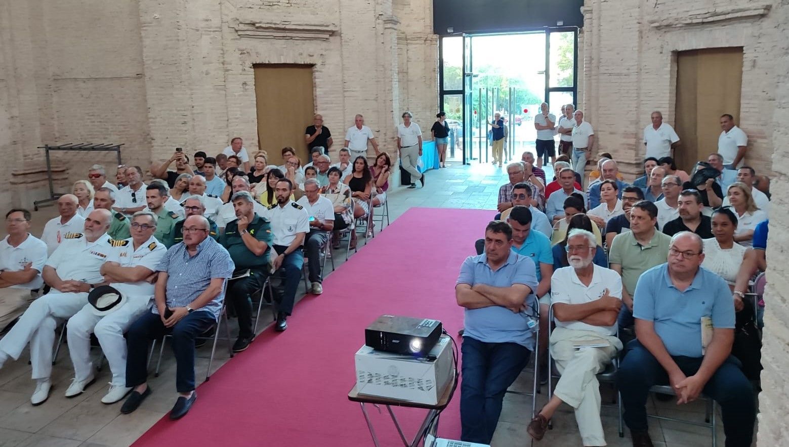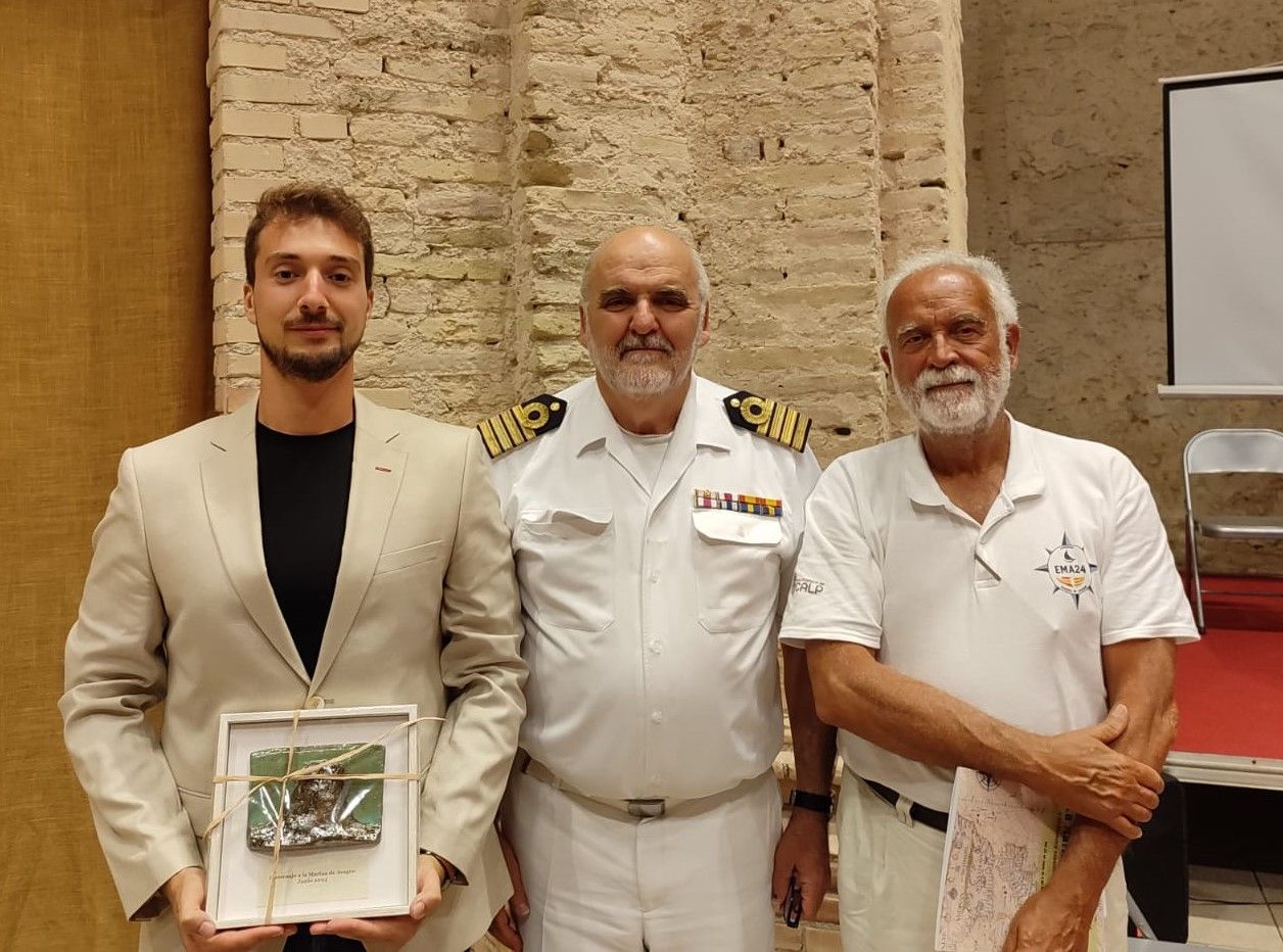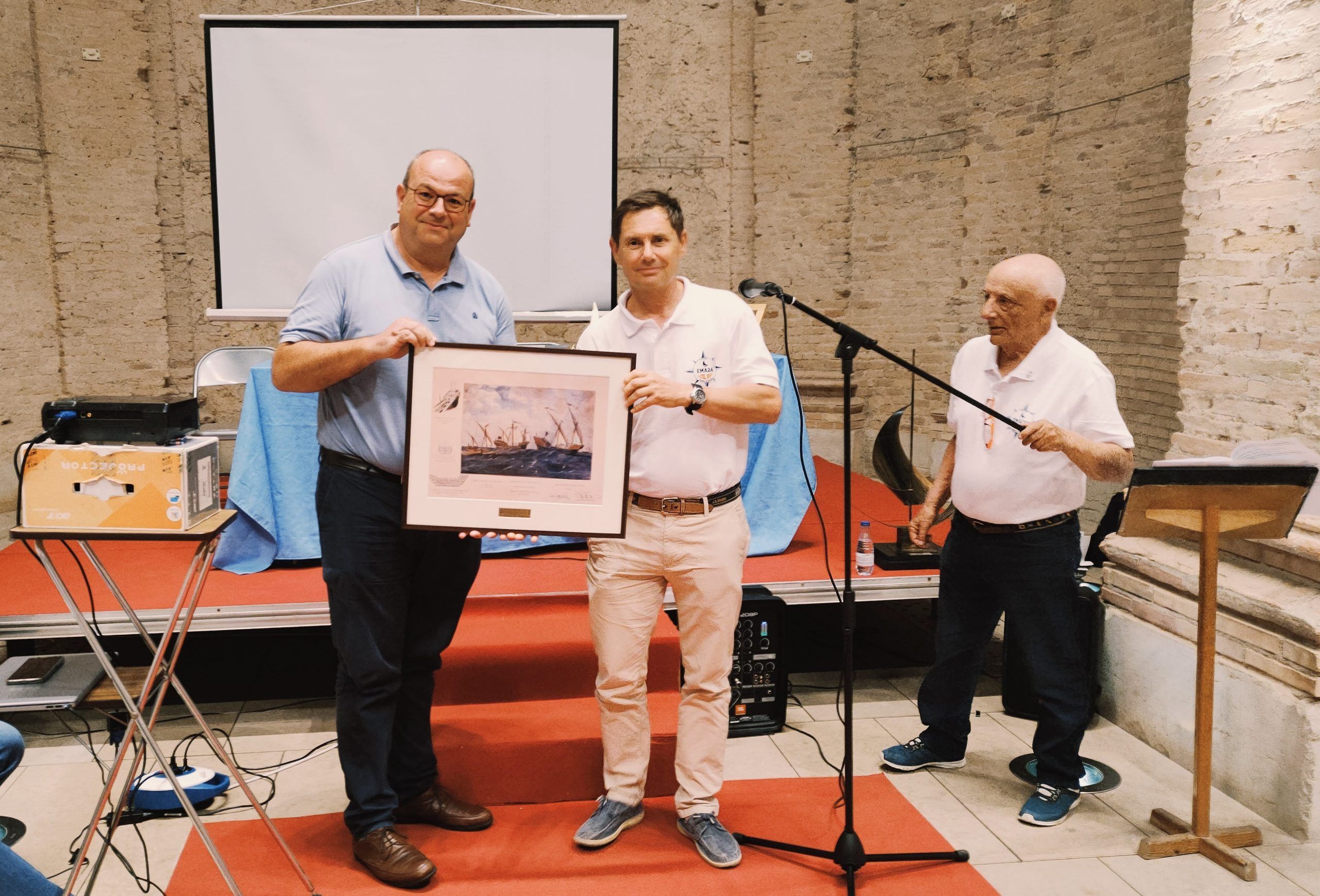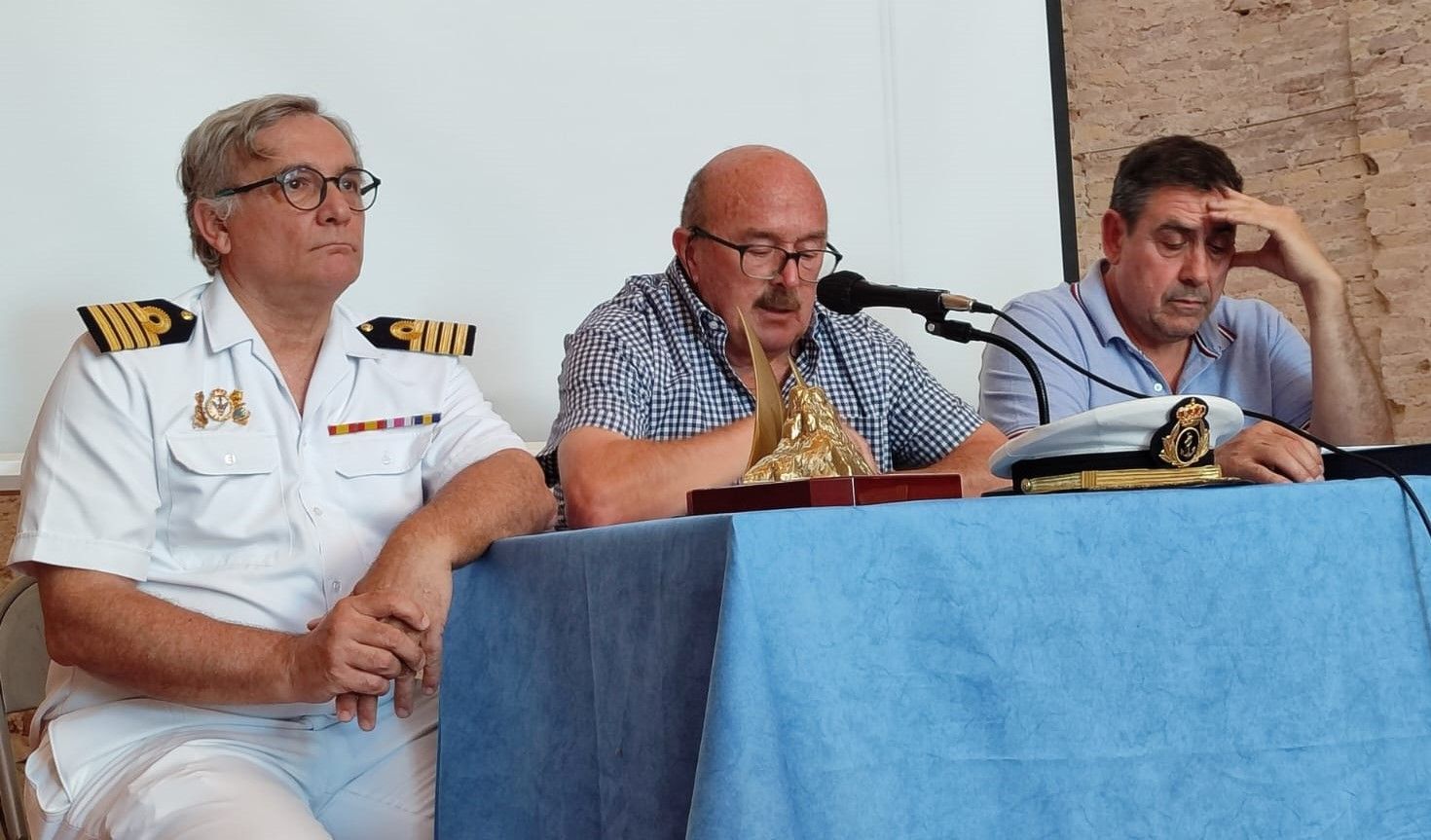 Para finalizar el Contralmirante (R) Cristóbal González-Aller Lacalle, perteneciente a la tripulación del velero «Prince Azur» realiza la entrega de la Distinción a la Cofradía de Pescadores de Sant Carles de La Rápita, destacando la importancia de esta cofradía, como podemos ver en la siguiente imagen.