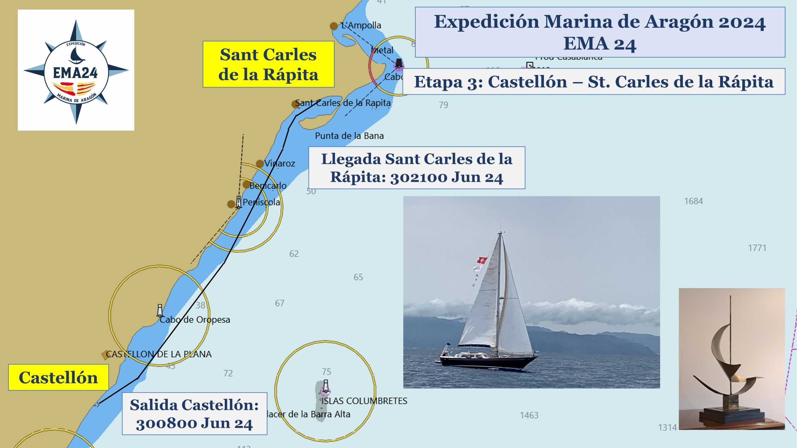 El pasado día 30 de junio por la mañana, zarpan siete veleros de Castellón para realizar la tercera etapa de la Expedición Marina de Aragón 2024 (EMA 24), quedando seis de ellos atracados en el Club Náutico de Sant Carles de la Rápita. Durante la estancia en este puerto se realizan diversos eventos, incluyendo un acto social y cultural en la “Eglèsia Nova”. El 2 de julio la flota de veleros zarpa de nuevo en demanda de Palma de Mallorca, comenzando la última etapa de la expedición.