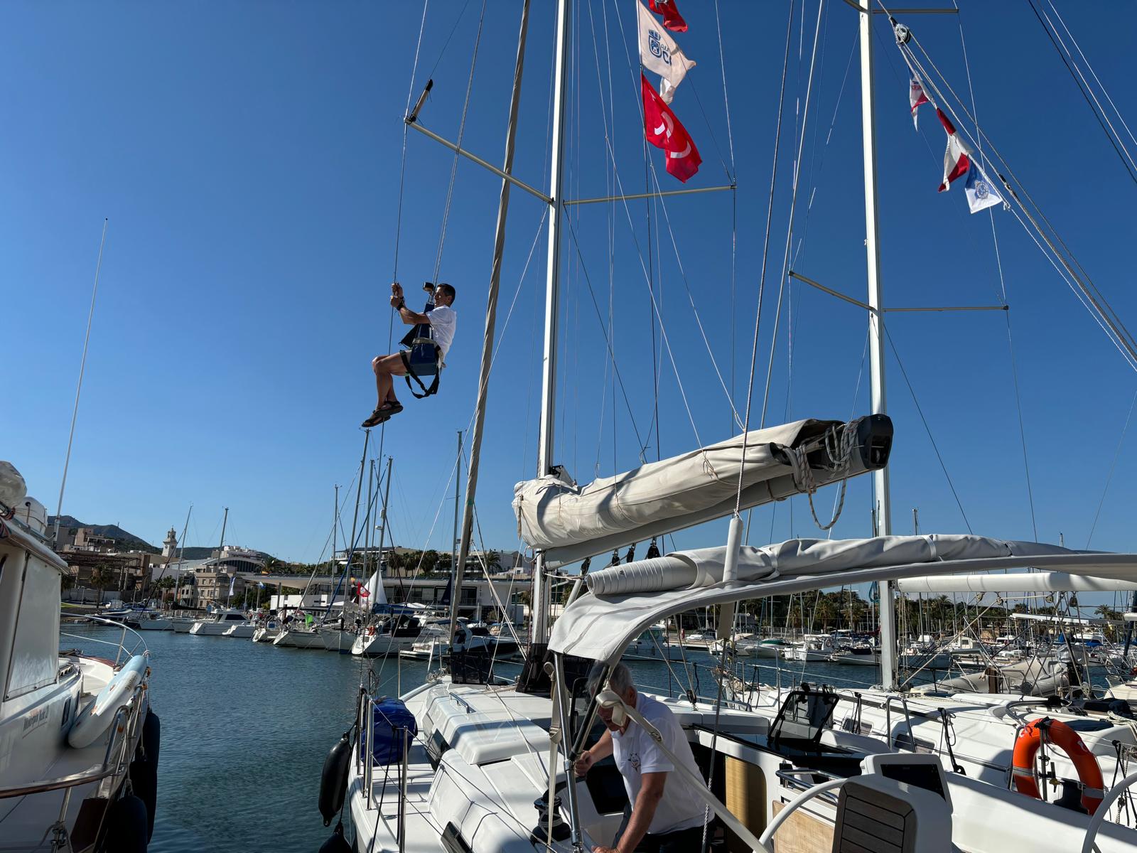 Siete veleros de la expedición barcos zarpan de Castellón el domingo 30 de junio a las 08:00 horas, con viento moderado del NE y marejada. Desafortunadamente, el velero FLORAX no puede continuar la expedición debido a un problema en el motor. En la imagen de arriba podemos ver la realización de trabajos de preparación en el velero «Casiopea», patroneado por Luis Navarrete.