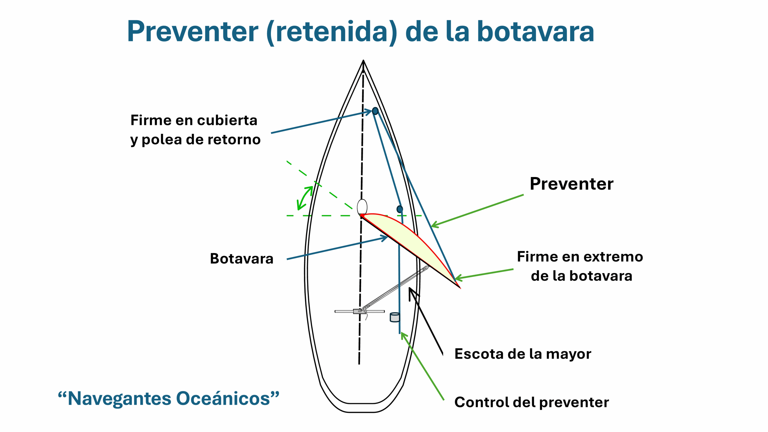 El preventer (o retenida) de la botavara es un aparejo cuyo objetivo es prevenir esta trasluchada involuntaria de la botavara. Es posible que no evitemos que el barco vire por redondo, pero evitaremos los daños que produciría el movimiento involuntario de la botavara.