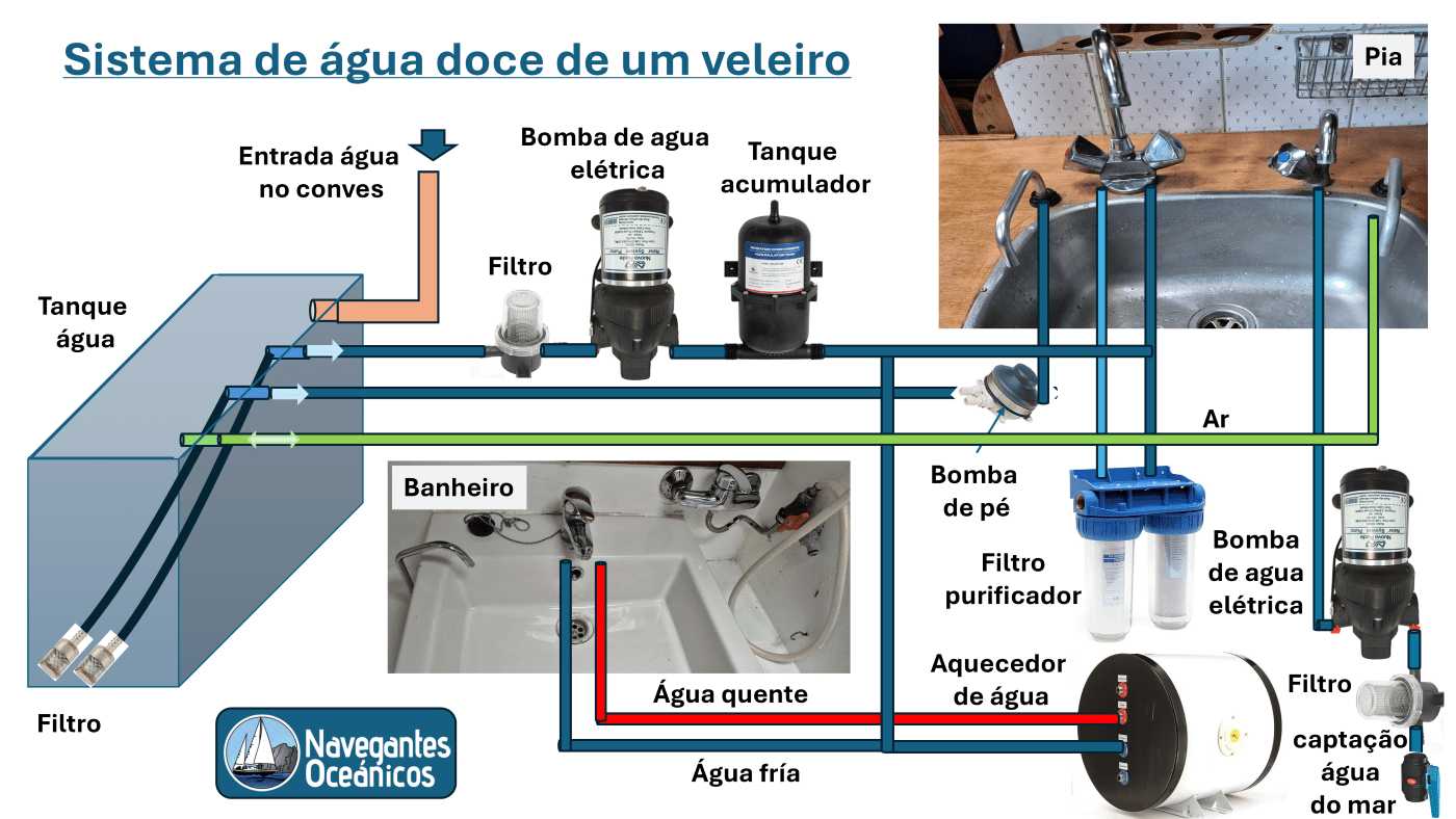 Além disso, no caso de um veleiro oceânico, necessitaremos de vários tanques para armazenar grandes quantidades de água doce (e/ou uma estação de tratamento de água), e de um sistema robusto, simples e redundante. Teremos também a opção de utilizar água do mar para conservar água doce; por exemplo, no lava-loiça da cozinha.